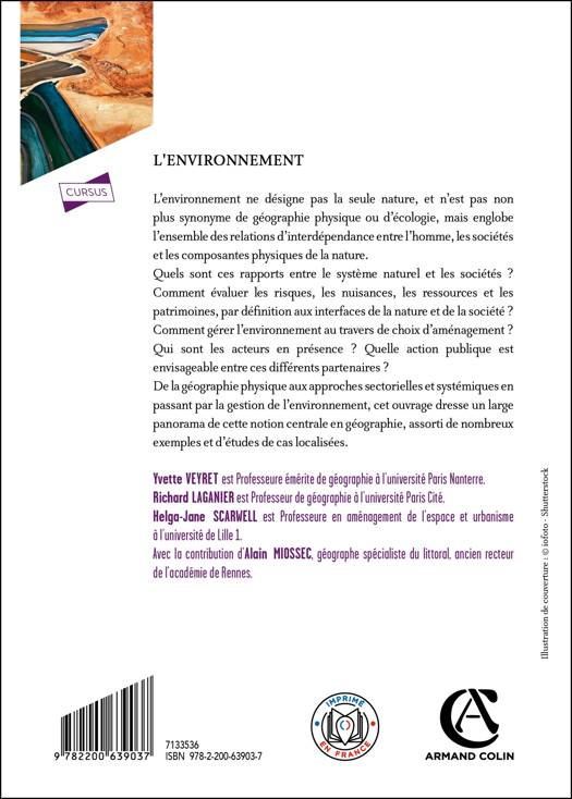 L’environnement ne désigne pas la seule nature, et n’est pas non plus synonyme de géographie physique ou d’écologie mais englobe l’ensemble des relations d’interdépendances entre l’homme, les sociétés et les composantes physiques de la nature. Cet ouvrage présente la manière dont la géographie traite de l’environnement : quelles sont les relations entre le système naturel et les sociétés ? Comment évaluer les risques, les nuisances, les ressources et les patrimoines, par définition aux interfaces de la nature et de la société ? Comment gérer l’environnement au travers de choix d’aménagement ? Qui sont les acteurs en présence ? Quelle action publique est envisageable entre ces différents partenaires ? Un large panorama sur une notion centrale en géographie, assorti de nombreux exemples et d’études de cas localisées.