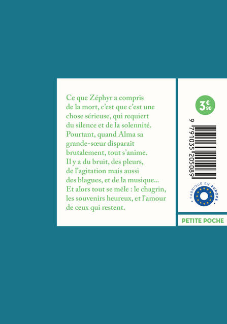 Ce que Zéphyr a compris de la mort, c'est que c'est une chose sérieuse, qui requiert du silence et de la solennité. Pourtant, quand Alma sa grande-soeur disparaît brutalement, tout s'anime. Il y a du bruit, des pleurs, de l'agitation mais aussi des blagues, et de la musique... Et alors tout se mêle : le chagrin, les souvenirs heureux, et l'amour de ceux qui restent.