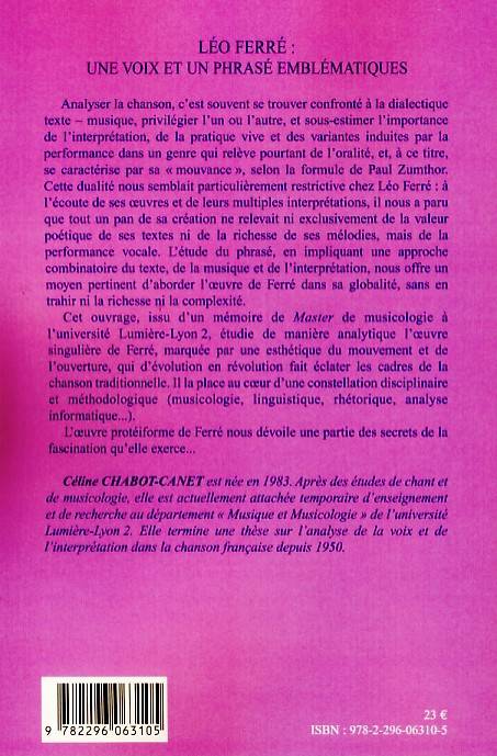 A l'écoute des oeuvres de Léo Ferré, il nous a paru que tout un pan de sa création ne relevait ni exclusivement de la valeur poétique de ses textes, ni de la richesse de ses mélodies, mais de la performance vocale. Cet ouvrage issu d'un mémoire de Master de musicologie propose une analyse singulière de l'oeuvre de Ferré et nous dévoile une partie des secrets de la fascination qu'elle exerce....
