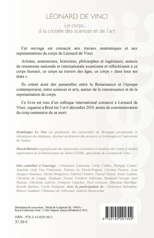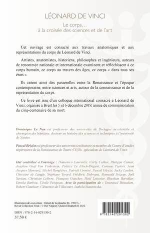 Cet ouvrage est consacré aux travaux anatomiques et aux représentations du corps de Léonard de Vinci. Artistes, anatomistes, historiens, philosophes et ingénieurs, auteurs de renommée nationale et internationale examinent et réfléchissent à ce corps humain, ce corps au travers des âges, ce corps « dans tous ses états ». Ils créent ainsi des passerelles entre la Renaissance et l'époque contemporaine, entre sciences et arts, autour de la connaissance et de la représentation du corps. Ce livre est issu d'un colloque international consacré à Léonard de Vinci, organisé à Brest les 5 et 6 décembre 2019, année de commémoration du cinq-centenaire de sa mort.