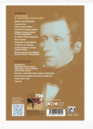 Le numéro de rentrée de L'Avant-Scène Cinéma est consacré à Leopardi, le film de Mario Martone (2014). Découpage intégral du film, dialogues en français et en italien, dossier complet sur l'oeuvre du grand cinéaste napolitain. Un dictionnaire de 47 cinéastes italiens d'aujourd'hui, un entretien exclusif avec Woody Allen, une longue analyse de la Palme d'Or de Cannes 2023 et des pages d'actualité complètent ce numéro exceptionnel.