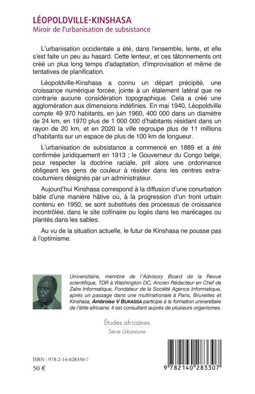 Léopoldville-Kinshasa a connu un départ précipité, une croissance numérique forcée, jointe à un étalement latéral que ne contrarie aucune considération topographique. Cela a créé une agglomération aux dimensions indéfinies. En mai 1940, Léopoldville compte 49 970 habitants, en juin 1960, 400 000 dans un diamètre de 24 km, en 1970 plus de 1 000 000 d habitants résidant dans un rayon de 20 km, et en 2020 la ville regroupe plus de 11 millions d'habitants sur un espace de plus de 100 km de longueur. Aujourd'hui Kinshasa correspond à la diffusion d'une conurbation bâtie d'une manière hâtive où, à la progression d'un front urbain contenu en 1950, se sont substitués des processus de croissance incontrôlée, dans le site collinaire ou logés dans les marécages ou plantés dans les sables. Au vu de la situation actuelle, le futur de Kinshasa ne pousse pas à l'optimisme.