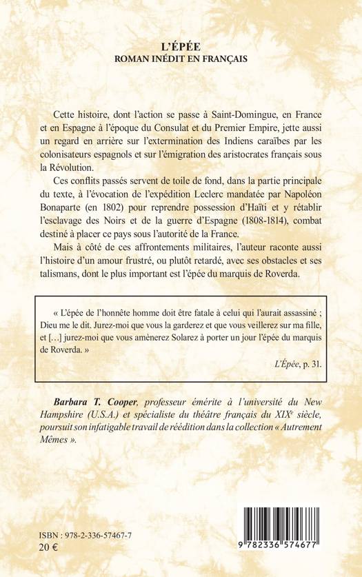 Cette histoire, dont l'action se passe à Saint-Domingue, en France et en Espagne à l'époque du Consulat et du Premier Empire, jette aussi un regard en arrière sur l'extermination des Indiens caraïbes par les colonisateurs espagnols et sur l'émigration des aristocrates français sous la Révolution. Ces conflits passés servent de toile de fond, dans la partie principale du texte, à l'évocation de l'expédition Leclerc mandatée par Napoléon Bonaparte (en 1802) pour reprendre possession d'Haïti et y rétablir l'esclavage des Noirs et de la guerre d'Espagne (1808-1814), combat destiné à placer ce pays sous l'autorité de la France. Mais à côté de ces affrontements militaires, l'auteur raconte aussi l'histoire d'un amour frustré, ou plutôt retardé, avec ses obstacles et ses talismans, dont le plus important est l'épée du marquis de Roverda. L'épée de l'honnête homme doit être fatale à celui qui l'aurait assassiné; Dieu me le dit. Jurez-moi que vous la garderez et que vous veillerez sur ma fille, et [...] jurez-moi que vous amènerez Solarez à porter un jour l'épée du marquis de Roverda. L'Épée, p. 31.