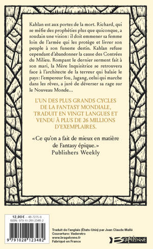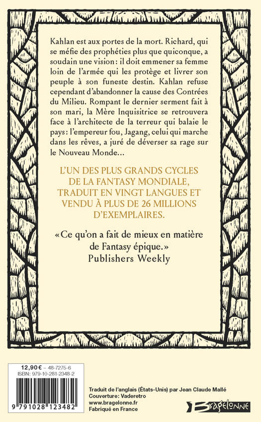 Kahlan est aux portes de la mort. Richard, qui se méfie des prophéties plus que quiconque, a soudain une vision : il doit emmener sa femme loin de l'armée qui les protège et livrer son peuple à son funeste destin. Kahlan refuse cependant d'abandonner la cause des Contrées du Milieu. Rompant le dernier serment fait à son mari, la Mère Inquisitrice se retrouvera face à l'architecte de la terreur qui balaie le pays : l'empereur fou, Jagang, celui qui marche dans les rêves, a juré de déverser sa rage sur le Nouveau Monde...