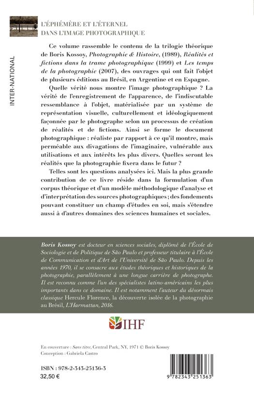 Ce volume rassemble le contenu de la trilogie théorique de Boris Kossoy, Photographie & Histoire (1989), Réalités et fictions dans la trame photographique (1999) et Les temps de la photographie (2007), ouvrages qui ont fait l’objet de plusieurs éditions au Brésil, en Argentine et en Espagne. Quelle vérité nous montre l’image photographique ? La vérité de l’enregistrement de l’apparence, de l’indiscutable ressemblance à l’objet, matérialisée par un système de représentation visuelle, culturellement et idéologiquement façonnée par le photographe selon un processus de création de réalités et de fictions. Ainsi se forme le document photographique : réaliste par rapport à ce qu’il montre, mais perméable aux divagations de l’imaginaire, vulnérable aux utilisations et aux intérêts les plus divers. Quelles seront les réalités que la photographie fixera dans le futur ? Telles sont les questions analysées ici. Mais la plus grande contribution de ce livre réside dans son corpus théorique et son modèle méthodologique d’analyse et d’interprétation des sources photographiques ; ces fondements peuvent constituer un champ d’études en soi, mais s’étendre aux sciences humaines et sociales.