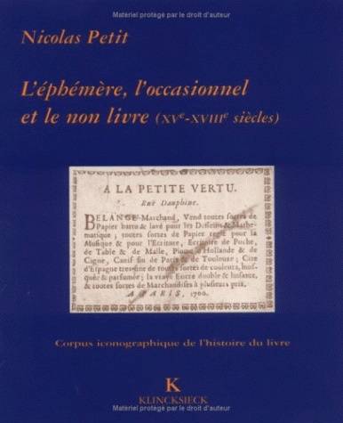 " L'histoire se sert donc de tout, d'une note de marchand, d'un livre de cuisine, d'un memoire de blanchisseuse " (George Sand). L'imprime ne se limite pas au livre et aux journaux. Faire-part, invitations, libelles, circulaires, factures a en-tete, reclames, travaux de ville, prospectus, images pieuses, tarifs, placards a afficher, massivement produits et massivement jetes, sont des publications ephemeres. Une typologie de l'ephemere et du non-livre, concepts en emergence, est esquissee a travers les fonds de la bibliotheque Sainte-Genevieve, ouvrant un chapitre inedit de l'histoire du livre.