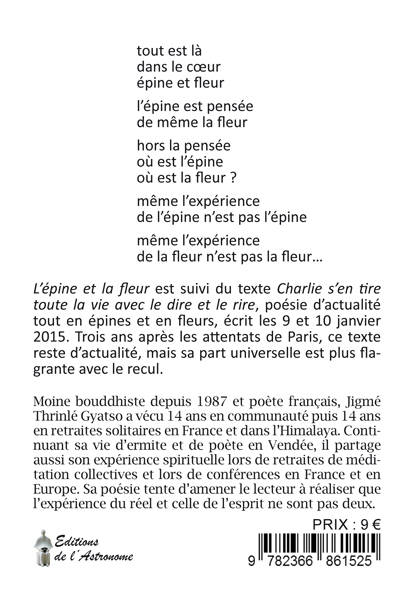 tout est là / dans le coeur / épine et fleur / lépine est pensée / de même la fleur / hors la pensée / où est lépine / où est la fleur ? même lexpérience / de lépine nest pas lépine / même lexpérience de la fleur / nest pas la fleur... Lépine et la fleur est suivi du texte Charlie sen tire toute la vie avec le dire et le rire, poésie dactualité tout en épines et en fleurs, écrit les 9 et 10 janvier 2015. Trois ans après les attentats de Paris, ce texte reste dactualité, mais sa part universelle est plus flagrante avec le recul.