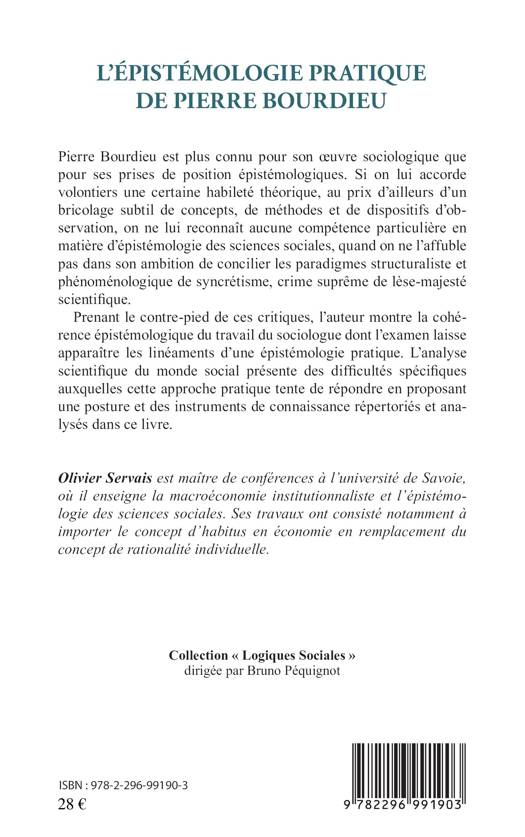 Pierre Bourdieu est plus connu pour son oeuvre sociologique que pour ses prises de position épistémologiques. Si on lui accorde volontiers une certaine habileté théorique, on ne lui reconnaît aucune compétence particulière en matière d'épistémologie des sciences sociales. Prenant le contre-pied de ces critiques, l'auteur montre la cohérence épistémologique du travail du sociologue.