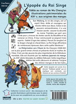 Abrégé de la Pérégrination vers l’Ouest, fidèle au roman de Wu Cheng’en avec les illustrations patrimoniales du XIXe s. des grands mangakas japonais qui sont aux origines des mangas : Sun Wukong, le roi des singes, est un esprit libre, drôle et courageux qui résiste même aux dieux. Grâce à ses pouvoirs extraordinaires, il a une mission sacrée : assurer la sécurité du moine Tripitaka qui part vers l’Inde pour y trouver les textes sacrés du Bouddha et les ramener en Chine. À leur communauté se joignent trois esprits : Sablet (l’Ogre des sables), Porcet (le sanglier) et le dragon changé en cheval blanc. Le Roi Singe affrontera de nombreuses épreuves dans cette quête fabuleuse ! La Pérégrination vers l’Ouest de Wu Cheng’en (1500-1582) est le plus grand roman chinois et présente récits et mythes de l’Asie. C’est une des œuvres les plus importantes de la littérature mondiale. Elle est illustrée par les maîtres japonais du manga du XIXe siècle (disciples du célèbre Hokusai). Cette magnifique édition fait enfin découvrir et admirer l’origine des shonen mangas et de Son Goku. Cette épopée est suivie d’un dossier Culture suivie qui en présente son contexte, son Histoire et ses centres d’intérêt