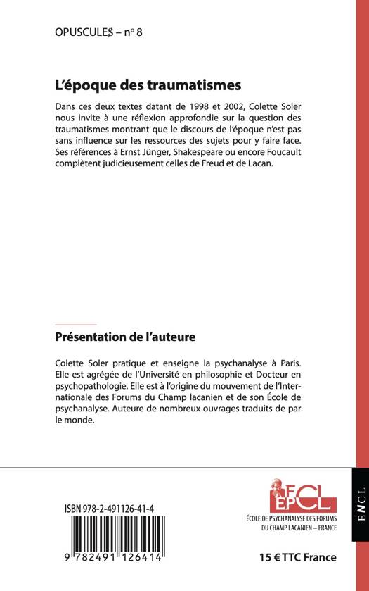 Dans ces deux textes datant de 1998 et 2002, Colette Soler nous invite à une réflexion approfondie sur la question des traumatismes montrant que le discours de l’époque n’est pas sans influence sur les ressources des sujets pour y faire face. Ses références à Ernst Jünger, Shakespeare ou encore Foucault complètent judicieusement celles de Freud et de Lacan.