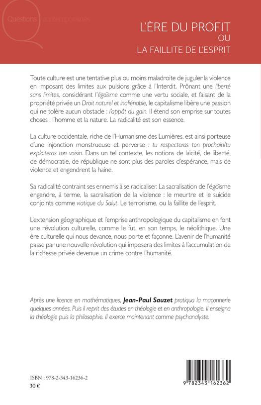 Toute culture est une tentative de juguler la violence. Prônant une liberté sans limites, faisant de l'égoïsme une vertu sociale et de la propriété privée un droit naturel inaliénable, le capitalisme libère une passion qui ne tolère pas d'obstacle et étend son emprise sur toutes choses : l'appât du gain. Dans un tel cadre, le respect pour autrui se double d'une exploitation du voisin. La radicalité de cette passion engendre une sacralisation de la violence et du terrorisme. L'avenir de l'humanité passe par une nouvelle révolution qui imposera des limites à l'accumulation de richesses.