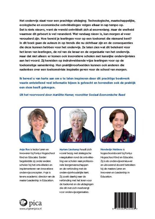 In dit boek gaan de auteurs in op trends die nu zichtbaar zijn en de consequenties die dat kan hebben voor het onderwijs. Ze laten zien wat dit betekent voor het leren van leerlingen, de rol van de leraar en de organisatie van het onderwijs. Maar dat niet alleen: er komen ook innovatieve scholen met kansrijke onderwijsvisies aan het woord. Zij bereiden op indrukwekkende wijze leerlingen voor op de toekomstige samenleving. Hun praktijkvoorbeelden kunnen ook anderen, die nadenken over een toekomstvisie, inspiratie geven voor de school van morgen.