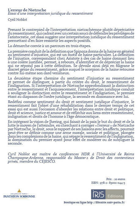 Prenant le contrepied de l’interprétation nietzschéenne plutôt dépréciative du ressentiment, qui cadrait avec un certain souci de défendre les privilèges de l’aristocratie, cet essai suggère une interprétation juridique du ressentiment permettant d’en faire ressortir les aspects positifs. La démarche convie à un parcours en trois étapes. La première conduit de la définition que Spinoza donna de la haine en général au sentiment d’injustice, qui est un motif de haine particulier. La définition de l’injustice, correspondant chez Aristote à des cas de haine donnant lieu à une colère justifiée, permet, à rebours, d’identifier et de déprécier la haine qui ne répond pas à cette définition. Se dévoile ainsi déjà en filigrane le discret génie du ressentiment, grâce auquel le scorpion de la haine retourne contre lui-même son dard venimeux. La deuxième étape chemine du sentiment d’injustice au ressentiment et permet de distinguer, à partir du critère du droit, le ressentiment de l’indignation. Si l’interprétation de Nietzsche approfondissait la distinction entre le ressentiment et l’acquiescement, l’interprétation juridique conduit à souligner la distinction entre le ressentiment et l’indignation, le premier étant au diapason de l’ordre juridique, la seconde en dissonance avec lui. Redéfini comme sentiment du droit et sentiment juridique d’injustice, le ressentiment fait l’objet d’une réhabilitation dans le dernier temps de cet essai qui est aussi l’occasion d’aborder les relations entre droit et politique, droit et science, justice et amour et de réfléchir aux liens entre ressentiment, indignation et droits de l’homme à l’âge démocratique. En intégrant la vision de Jhering, qui faisait de la paix le but du droit et de la lutte le moyen de l’atteindre, en cherchant à corriger « l’erreur » de Nietzsche par Nietzsche, le droit, sous le rapport de ses liaisons avec les affects, pourrait peut-être se définir comme une arme morale, sociale et politique, plongée dans les complexions de la haine, qui sépare le ressentiment de l’indignation, la domination du premier ayant pour effet de modérer ou de subjuguer la seconde.