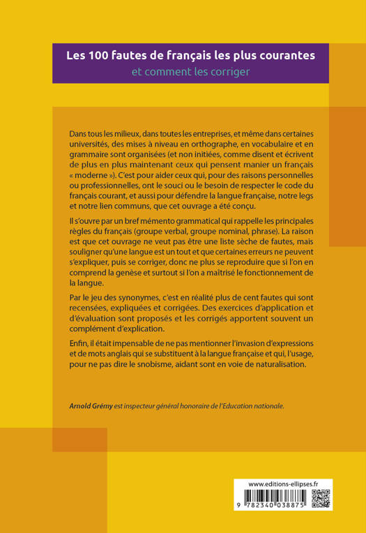 Dans tous les milieux, dans toutes les entreprises, et même dans certaines universités, des mises à niveau en orthographe, en vocabulaire et en grammaire sont organisées. C’est pour aider ceux qui, pour des raisons personnelles ou professionnelles, ont le souci ou le besoin de respecter le code du français courant que cet ouvrage a été conçu. Il s’ouvre par un bref mémento grammatical qui rappelle les principales règles du français. Ensuite, plus de cent fautes sont recensées, expliquées et corrigées. Des exercices d’application et d’évaluation sont proposés et les corrigés apportent souvent un complément d’explication.