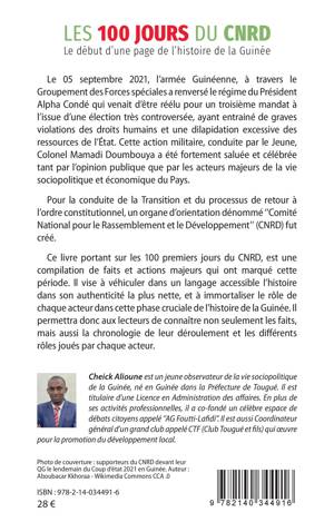 Le 05 septembre 2021, l'armée Guinéenne, à travers le Groupement des Forces spéciales a renversé le régime du Président Alpha Condé qui venait d'être réélu pour un troisième mandat à l'issue d'une élection très controversée. Cette action militaire, conduite par le Colonel Mamadi Doumbouya a été fortement saluée et célébrée tant par l'opinion publique que par les acteurs majeurs de la vie sociopolitique et économique du Pays. Pour la conduite de la Transition et du processus de retour à l'ordre constitutionnel, un organe d'orientation dénommé ''Comité National pour le Rassemblement et le Développement'' (CNRD) fut créé. Ce livre portant sur les 100 premiers jours du CNRD, est une compilation de faits et actions majeurs qui ont marqué cette période. Il vise à véhiculer dans un langage accessible l'histoire dans son authenticité la plus nette, et à immortaliser le rôle de chaque acteur dans cette phase cruciale de l'histoire de la Guinée.