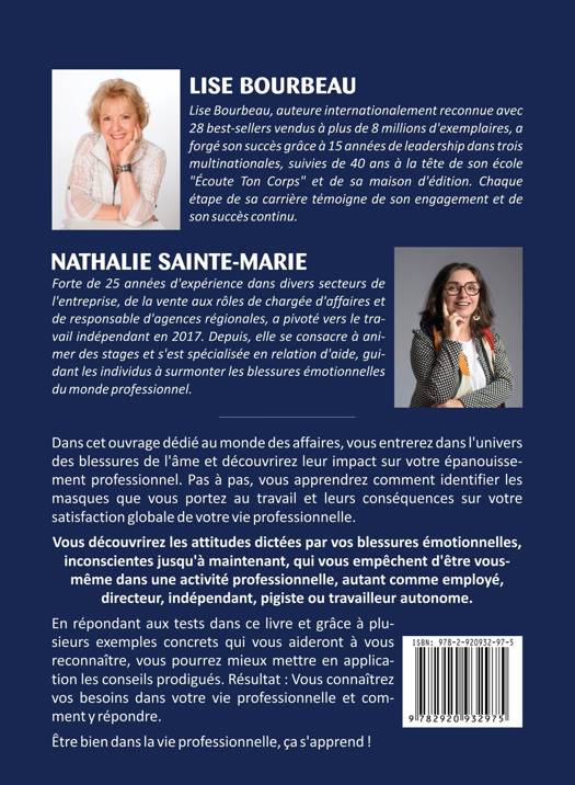 Lorsque Lise Bourbeau a écrit le premier tome du livre « Les 5 blessures qui empêchent d’être soi-même » en 2000, elle était loin d’imaginer que ce dernier toucherait plus de 2,6 millions de lecteurs à travers le monde ! C’est ce même livre qui a été offert à Nathalie Sainte-Marie par un de ses clients lors d’un déjeuner d’affaires en 2007, alors qu’elle exerçait une fonction commerciale dans laquelle elle performait tout autant qu’elle se sentait handicapée émotionnellement. Dans cet ouvrage dédié au monde des affaires, vous entrerez dans l’univers des blessures de l’âme et découvrirez leur impact sur votre épanouissement professionnel. Pas à pas, vous apprendrez comment identifier les masques que vous portez au travail et leurs conséquences sur votre satisfaction globale de votre vie professionnelle.