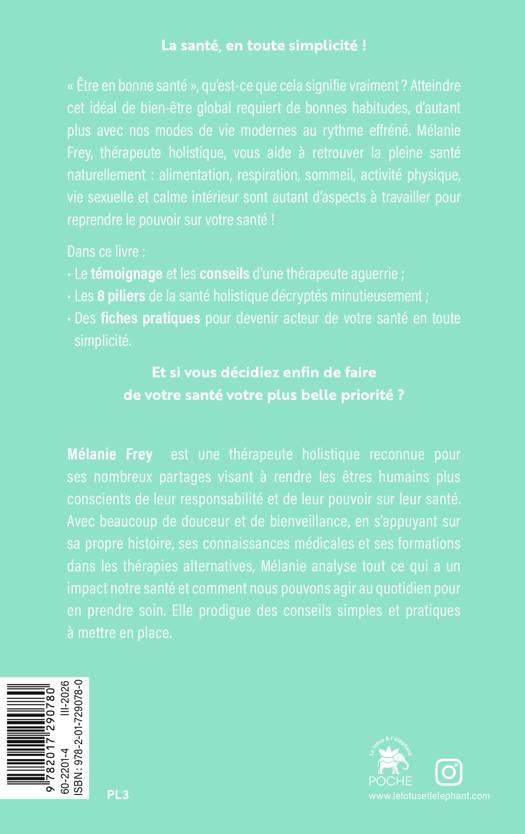 « Être en bonne santé », qu’est-ce que cela signifie vraiment ? Atteindre cet idéal de bien-être global requiert de bonnes habitudes, d’autant plus avec nos modes de vie modernes au rythme effréné. Mélanie Frey, thérapeute holistique, vous aide à retrouver la pleine santé naturellement : alimentation, respiration, sommeil, activité physique, vie sexuelle et calme intérieur sont autant d’aspects à travailler pour reprendre le pouvoir sur votre santé !