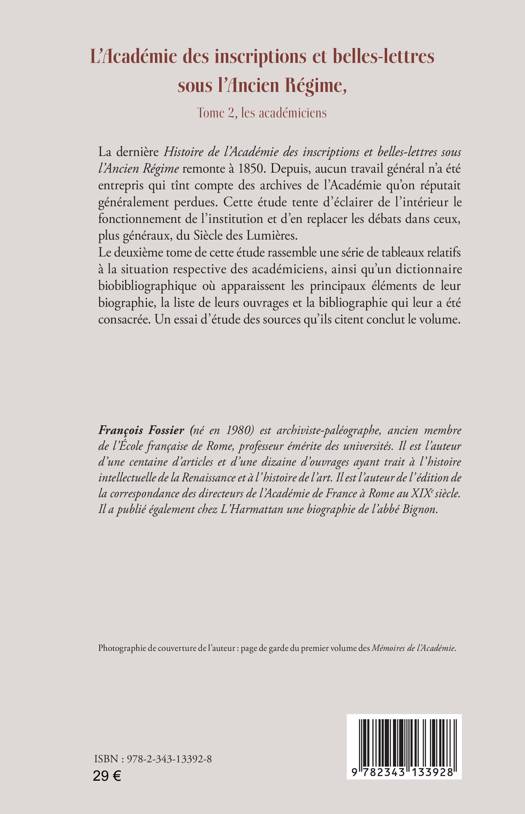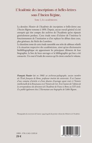 La dernière Histoire de l’Académie des inscriptions et belles-lettres sous l’Ancien Régime remonte à 1850. Depuis, aucun travail basé sur les archives n’a été entrepris. Ce deuxième volume montre la situation des académiciens à travers une série de tableaux. Il contient un dictionnaire biobibliographique et un essai d’étude des sources qu’ils citent.