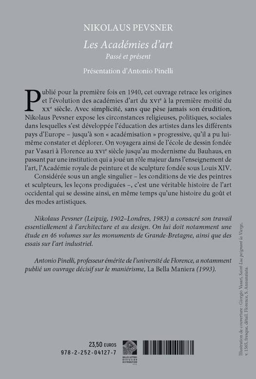 Publie pour la premiere fois en 1940, cet ouvrage retrace les origines et l'evolution des academies d'art du XVIe a la premiere moitie du XXe siecle. Avec simplicite, sans que pese jamais son erudition, Nikolaus Pevsner expose les circonstances religieuses, politiques, sociales dans lesquelles s'est developpee l'education des artistes dans les differents pays d'Europe - jusqu'a son academisation progressive, qu'il a pu lui-meme constater et deplorer. On voyagera ainsi de l'ecole de dessin fondee par Vasari a Florence au XVIe siecle jusqu'au modernisme du Bauhaus, en passant par une institution qui a joue un role majeur dans l'enseignement de l'art, l'Academie royale de peinture et de sculpture fondee sous Louis XIV.Consideree sous un angle singulier - les conditions de vie des peintres et sculpteurs, les lecons prodiguees -, c'est une veritable histoire de l'art occidental qui se dessine ainsi, en meme temps qu'une histoire du gout et des modes artistiques.