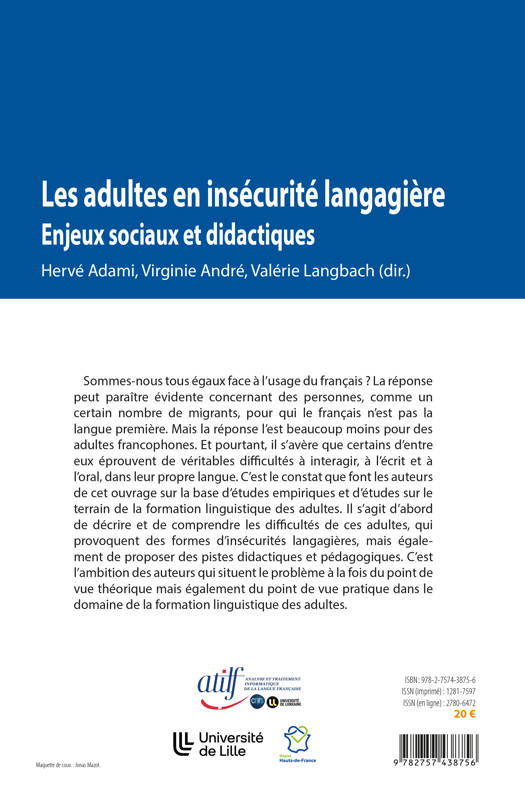 Sommes-nous tous égaux face à l'usage du français ? La réponse peut paraître évidente concernant des personnes, comme un certain nombre de migrants, pour qui le français n'est pas la langue première. Mais la réponse l'est beaucoup moins pour des adultes francophones. Et pourtant, il s'avère que certains d'entre eux éprouvent de véritables difficultés à interagir, à l'écrit et à l'oral, dans leur propre langue. C'est le constat que font les auteurs de cet ouvrage sur la base d'études empiriques et d'études sur le terrain de la formation linguistique des adultes. Il s'agit d'abord de décrire et de comprendre les difficultés de ces adultes, qui provoquent des formes d'insécurités langagières, mais également de proposer des pistes didactiques et pédagogiques. C'est l'ambition des auteurs qui situent le problème à la fois du point de vue théorique mais également du point de vue pratique dans le domaine de la formation linguistique des adultes.