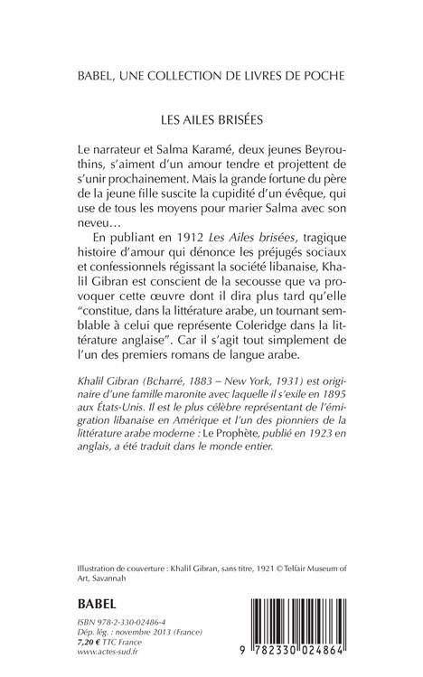 En publiant en 1912 Les Ailes brisées, tragique histoire d'amour qui dénonce les préjugés sociaux et confessionnels régissant la société libanaise, Khalil Gibran est conscient de la secousse que va provoquer cette oeuvre dont il dira plus tard qu'elle "constitue, dans la littérature arabe, un tournant semblable à celui que représente Coleridge dans la littérature anglaise". Car il s'agit tout simplement de l'un des premiers romans de langue arabe.