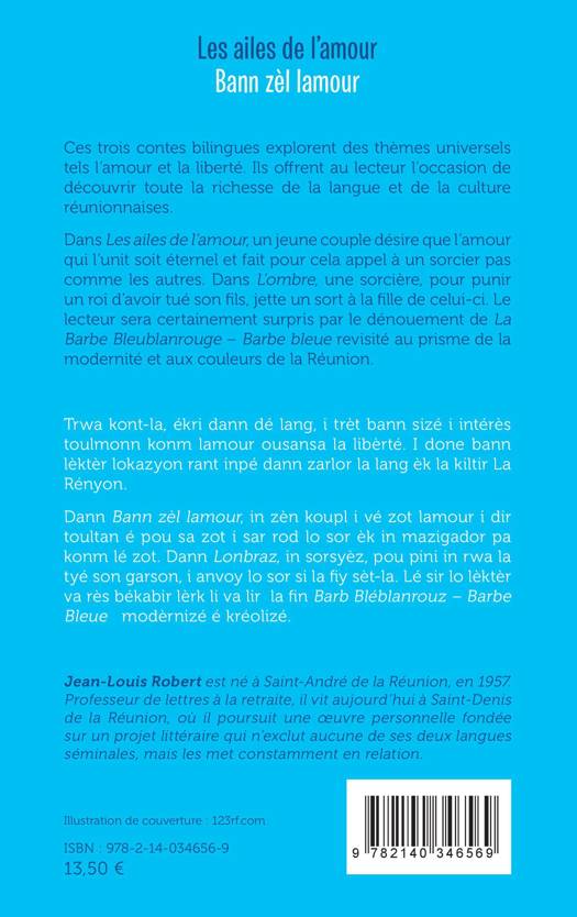 Ces trois contes bilingues créole réunionnais-français explorent des thèmes universels tels l'amour et la liberté. Ils offrent au lecteur l'occasion de découvrir toute la richesse de la langue et de la culture réunionnaises. Dans Les ailes de l'amour, un jeune couple désire que l'amour qui l'unit soit éternel et fait pour cela appel à un sorcier pas comme les autres. Dans L'ombre, une sorcière, pour punir un roi d'avoir tué son fils, jette un sort à la fille de celui-ci. Le lecteur sera certainement surpris par le dénouement de La Barbe Bleublanrouge - Barbe bleue revisité au prisme de la modernité et aux couleurs de la Réunion. Trwa kont-la, ékri dann dé lang, i trèt bann sizé i intérès toulmonn konm lamour ousansa la libèrté. I done bann lèktèr lokazyon rant inpé dann zarlor la lang èk la kiltir La Rényon. Dann Bann zèl lamour, in zèn koupl i vé zot lamour i dir toultan épou sa zot i sar rod lo sor èk in mazigador pa konm lé zot. Dann Lonbraz, in sorsyèz, pou pini in rwa la tyé son garson, i anvoy lo sor si la fi y sèt-la. Lé sir lo lèktèr va rès békabir lèrk li va lir la fin Barb Bléblanrouz - Barbe Bleue modèrnizé é kréolizé.