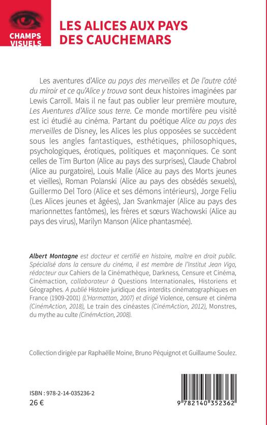 Les aventures d'Alice au pays des merveilles et De l'autre côté du miroir et ce qu'Alice y trouva sont deux histoires imaginées par Lewis Carroll. Mais il ne faut pas oublier leur première mouture, Les Aventures d'Alice sous terre. Ce monde mortifère peu visite est ici étudié au cinéma. Partant du poétique Alice au pays des merveilles de Disney, les Alices les plus opposées se succèdent sous les angles fantastiques, esthétiques, philosophiques, psychologiques, érotiques, politiques et maçonniques. Ce sont celles de Tim Burton (Alice au pays des surprises), Claude Chabrol (Alice au purgatoire), Louis Malle (Alice au pays des Morts jeunes et vieilles), Roman Polanski (Alice au pays des obsédés sexuels), Guillermo Del Toro (Alice et ses démons intérieurs), Jorge Feliu (Les Alices jeunes et âgées), Jan Svankmajer (Alice au pays des marionnettes fantômes), les frères et surs Wachowski (Alice au pays des virus), Marilyn Manson (Alice phantasmée).