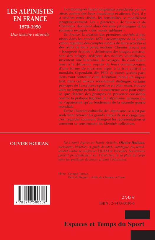 Longtemps considérés par nos aïeux comme des lieux inquiétants et affreux, les montagnes alpines devinrent des sites pittoresques et les sommets escarpés " des monts sublimes ". Toutefois après deux siècles d'existence, l'alpinisme n'a rien perdu de son ambiguïté originelle. Ecrire l'histoire culturelle de l'alpinisme, ce n'est pas seulement retracer les grandes étapes de sa sociogenèse, c'est regarder comment changent les représentations et comment se construisent les identités collectives.