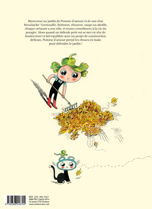 Bienvenue au jardin de Pomme d'amour et de son chat Moustache ! Grenouille, hérisson, chouette, taupe ou abeille, chaque créature a son rôle, et toutes contribuent à la vie du potager. Alors quand un ridicule petit roi se met en tête de bouleverser ce bel équilibre avec un projet de construction délirant, Pomme d'amour prend les choses en main pour défendre le jardin !