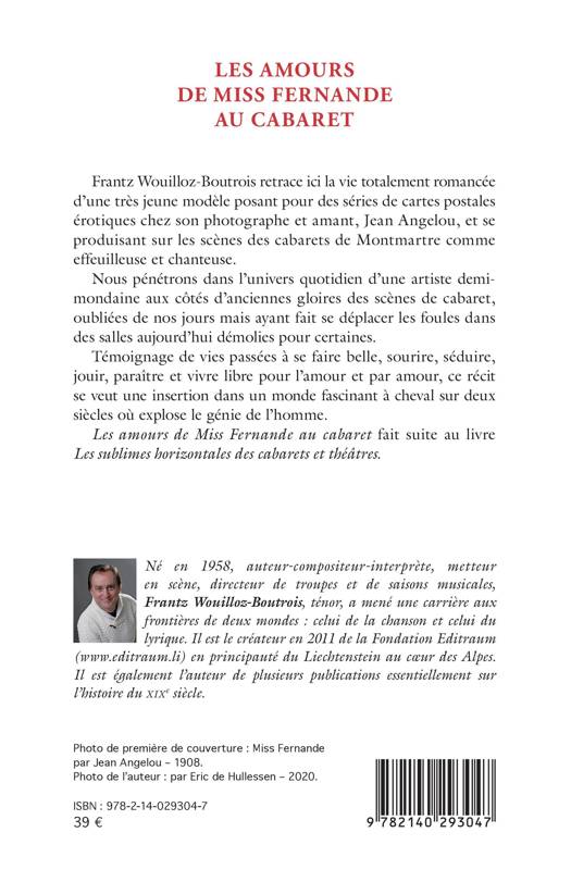 Frantz Wouilloz-Boutrois retrace ici la vie totalement romancée d'une très jeune modèle posant pour des séries de cartes postales érotiques chez son photographe et amant, Jean Angelou, et se produisant sur les scènes des cabarets de Montmartre comme effeuilleuse et chanteuse. Nous pénétrons dans l'univers quotidien d'une artiste demi-mondaine aux côtés d'anciennes gloires des scènes de cabaret, oubliées de nos jours mais ayant fait se déplacer les foules dans des salles aujourd'hui démolies pour certaines. Témoignage de vies passées à se faire belle, sourire, séduire, jouir, paraître et vivre libre pour l'amour et par amour, ce récit se veut une insertion dans un monde fascinant à cheval sur deux siècles où explose le génie de l'homme. Les amours de Miss Fernande au cabaret fait suite au livre Les sublimes horizontales des cabarets et théâtres.