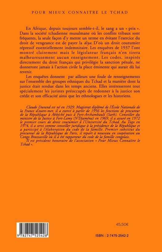 En Afrique, depuis toujours semble-t-il, le sang a un « prix ». Dans la société tchadienne musulmane où les conflits tribaux sont fréquents, la seule façon d'y mettre un terme en évitant l'exercice du droit de vengeance est de payer la diya. D'où un droit coutumier répressif essentiellement indemnitaire. Les enquêtes de 1937 l'ont montré clairement mais le législateur français n'en tirera malheureusement aucun enseignement. Les codes, inspirés directement du droit français qui privilégie la sanction pénale, ne donneront jamais à l'action civile la place éminente qui aurait dû lui revenu.