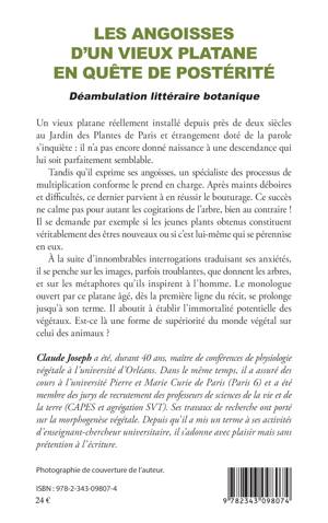 Un vieux platane réellement installé depuis près de deux siècles au Jardin des Plantes de Paris et étrangement doté de la parole s'inquiète : il n'a pas encore donné naissance à une descendance qui lui soit parfaitement semblable. Après maints déboires et difficultés, un spécialiste du processus de multiplication parvient à réussir son bouturage. Ce succès ne calme pas pour autant les cogitations de l'arbre, bien au contraire ! À la suite d'innombrables interrogations traduisant ses anxiétés, il se penche sur les images, parfois troublantes, que donnent les arbres, et sur les métaphores qu'ils inspirent à l'homme.