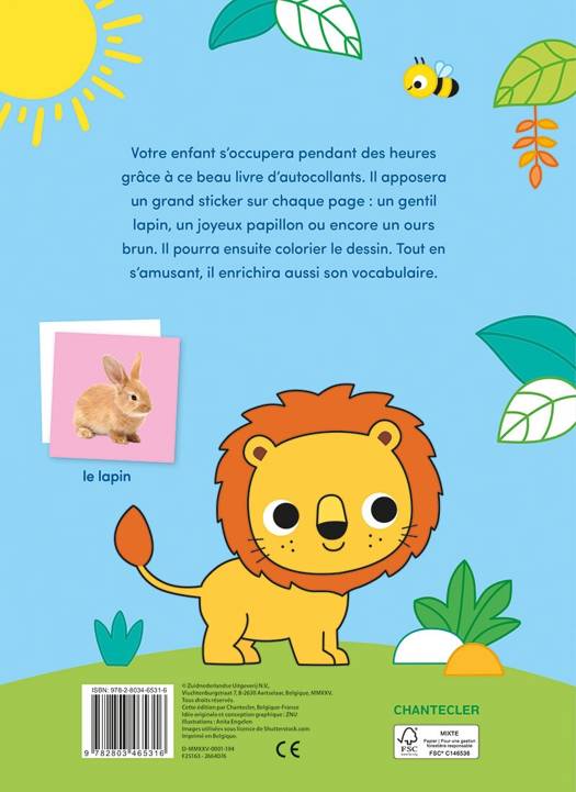 Votre enfant s'occupera pendant des heures grâce à ce beau livre d'autocollants. Il apposera un grand sticker sur chaque page : un gentil lapin, un joyeux papillon ou encore un ours brun. Il pourra ensuite colorier le dessin. Tout en s'amusant, il enrichira aussi son vocabulaire.