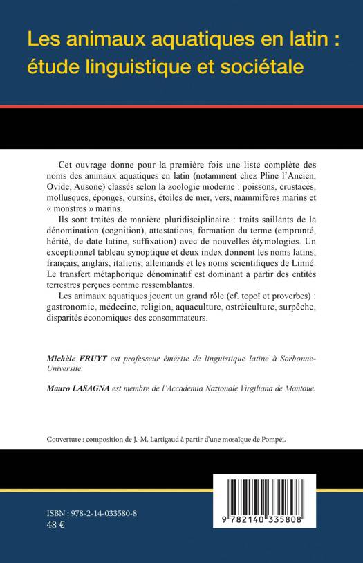 Cet ouvrage donne pour la première fois une liste complète des noms des animaux aquatiques en latin (notamment chez Pline l'Ancien, Ovide, Ausone) classés selon la zoologie moderne: poissons, crustacés, mollusques, éponges, oursins, étoiles de mer, vers, mammifères marins et monstres marins. Ils sont traités de manière pluridisciplinaire: traits saillants de la dénomination (cognition), attestations, formation du terme (emprunté, hérité, de date latine, suffixation) avec de nouvelles étymologies. Un exceptionnel tableau synoptique et deux index donnent les noms latins, français, anglais, italiens, allemands et les noms scientifiques de Linné. Le transfert métaphorique dénominatif est dominant à partir des entités terrestres perçues comme ressemblantes. Les animaux aquatiques jouent un grand rôle (cf. topoï et proverbes): gastronomie, médecine, religion, aquaculture, ostréiculture, surpêche, disparités économiques des consommateurs.