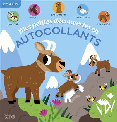 De grandes scènes sur le thème des animaux de la montagne à compléter à l'aide d'autocollants, accompagnées d'informations sur la marmotte, l'aigle et le chamois.