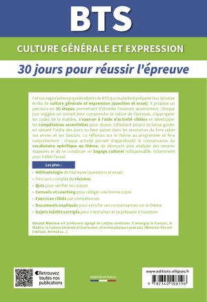 L’ouvrage s’adresse aux étudiants de BTS qui souhaitent préparer leur épreuve écrite de culture générale et expression. Il propose un parcours en 30 étapes permettant d’aborder l’épreuve sereinement. Chaque jour suggère un conseil, une recommandation clé, pour comprendre la nature de l’épreuve, s’approprier les codes de la matière, s’exercer à l’aide d’activité ciblées et développer les compétences essentielles pour réussir. L’étudiant pourra se laisse guider en suivant l’ordre des jours ou bien puiser dans les ressources du livre selon ses envies et ses besoins. L'ouvrage est un compagnon annuel ou un outil de révision ponctuel à l’approche des échéances (devoir sur table, BTS blanc ou épreuve certificative). La réflexion sur le thème au programme se fera conjointement : chaque activité permet d’approfondir la connaissance du vocabulaire spécifique au thème et/ou de découvrir puis analyser des œuvres majeures pour se constituer un bagage culturel indispensable pour traiter la deuxième partie de l’épreuve, l’essai.