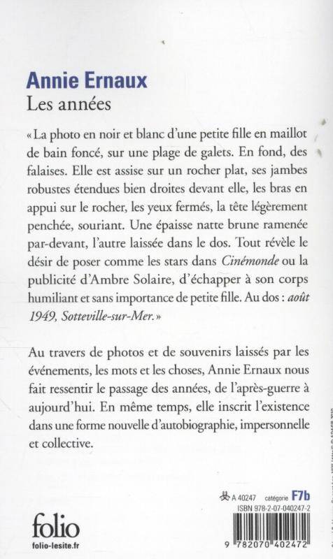 Au dos : août 1949, Sotteville-sur-Mer." Au travers de photos et de souvenirs laissés par les événements, les mots et les choses, Annie Ernaux nous fait ressentir le passage des années, de l'après-guerre à aujourd'hui. En même temps, elle inscrit l'existence dans une forme nouvelle d'autobiographie, impersonnelle et collective.