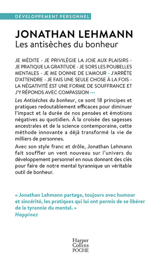 « Jonathan Lehmann partage, toujours avec humour et sincérité, les pratiques qui lui ont permis de se libérer de la tyrannie du mental. » Happinez