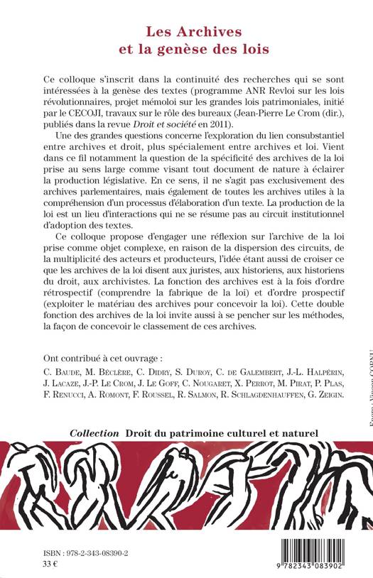 Ces contributions proposent d'engager une réflexion sur l'archive de la loi prise comme objet complexe, en raison de la dispersion des circuits, de la multiplicité des acteurs et producteurs, l'idée étant aussi de croiser ce que les archives de la loi disent aux juristes, aux historiens, aux historiens du droit, aux archivistes. À la fois rétrospective et prospective, la fonction des archives de la loi invite également à se pencher sur les méthodes, la façon de concevoir le classement de ces archives.