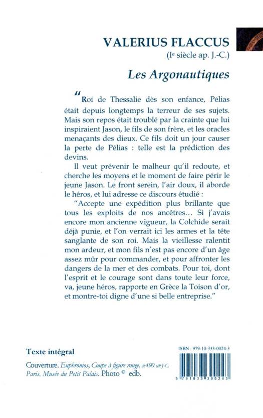 « Accepte une expédition plus brillante que tous les exploits de nos ancêtres... Si j'avais encore mon ancienne vigueur, la Colchide serait déjà punie, et l'on verrait ici les armes et la tête sanglante de son roi. Mais la vieillesse ralentit mon ardeur, et mon fils n'est pas encore d'un âge assez mûr pour commander, et pour affronter les dangers de la mer et des combats. Pour toi, dont l'esprit et le courage sont dans toute leur force, va, jeune héros, rapporte en Grèce la Toison d'or, et montre-toi digne d'une si belle entreprise. »