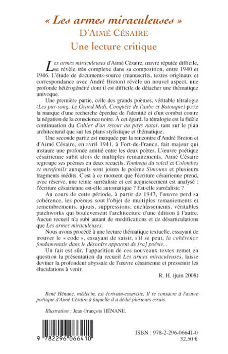 Les armes miraculeuses d'Aimé Césaire, oeuvre réputée difficile se révèle très complexe dans sa composition, entre 1940 et 1946. L'étude de documents-source révèle un nouvel aspect. Une première partie, celle des grands poèmes, porte la marque d'une recherche éperdue de l'identité et d'un combat contre la négation de la conscience noire. Une seconde partie est marquée par la rencontre d'André Breton et d'Aimé Césaire, en avril 1941, à Fort-de-France, fait majeur qui instaure une profonde amitié entre les deux poètes. L'oeuvre poétique césairienne subit alors de multiples remaniements.