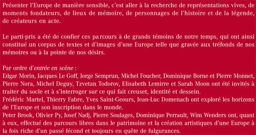 Présenter l'Europe de manière sensible, c'est aller à la recherche de représentations vives, de moments fondateurs, de lieux de mémoire, de personnages de l'histoire et de la légende, de créateurs en acte