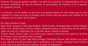 Peter Brook, Olivier Py, Josef Nadj, Pierre Soulages, Dominique Perrault, Wim Wenders ont, quant à eux, effectué des parcours libres dans le patrimoine et la création artistiques d'une Europe à la fois riche d'un passé fécond et toujours en quête de fulgurances.