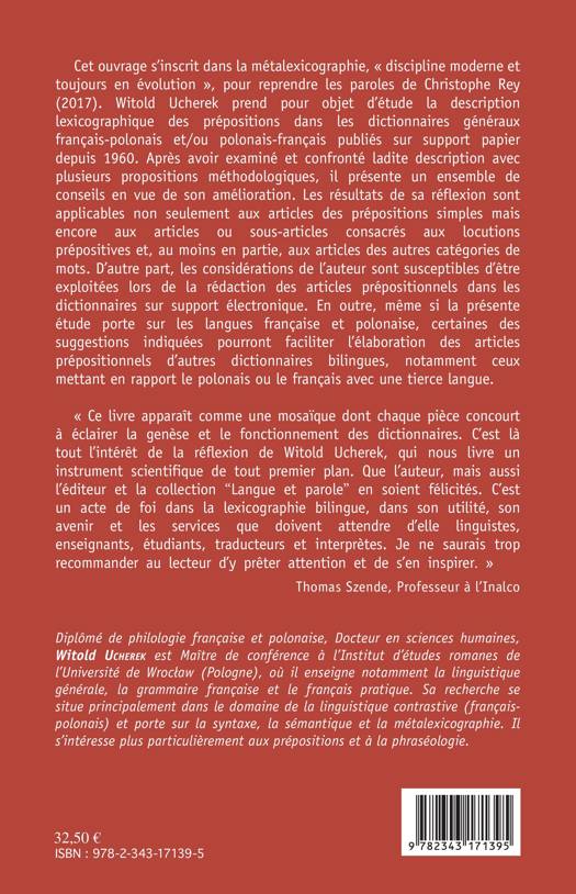 Cet ouvrage s'inscrit dans la métalexicographie : une discipline moderne et toujours en évolution" pour reprendre les paroles de Christophe Rey (2017). L'auteur prend pour objet d'étude la description lexicographique des prépositions dans les dictionnaires généraux franco-polonais et/ou polonais-français publiés sur support papier depuis 1960.