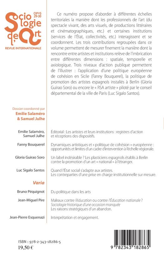 Ce numéro propose d'aborder à différentes échelles territoriales la manière dont tous les professionnels de l'art (du spectacle vivant, des arts visuels, de productions littéraires et cinématographiques, etc.) et certaines institutions (services de l'Etat, collectivités, etc.) interagissent et se coordonnent. Les trois contributions regroupées dans ce volume permettent de mesurer finement la manière dont la rencontre entre artistes et institutions relève de l'imbrication entre différentes dimensions : spatiale, temporelle et axiologique. Trois niveaux d'action publique permettent de l'illustrer : l'application d'une politique européenne de cohésion en Sicile (Fanny Bouquerel), la politique de promotion des artistes espagnols installés à Berlin (Gloria Guirao Soro) ou encore le "RSA artiste" piloté par le conseil départemental de la ville de Paris (Luc Sigalo Santos).