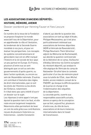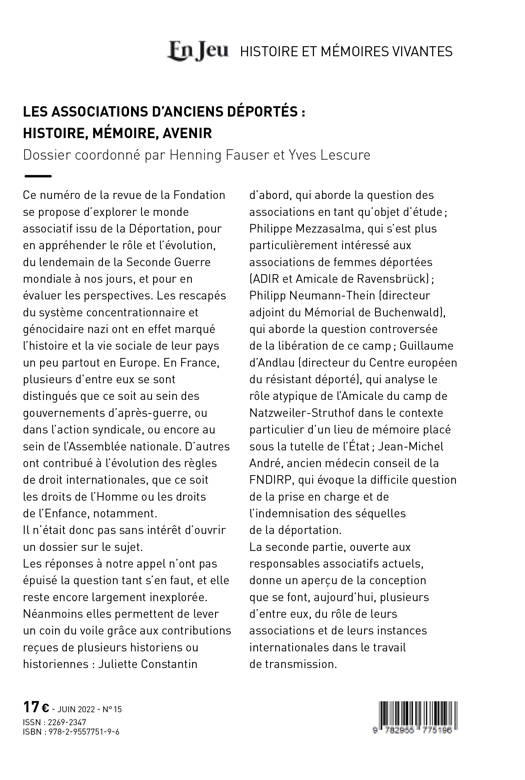 Ce numéro de La revue de la Fondation se propose d'explorer le monde associatif issu de la Déportation, pour en appréhender le rôle et l'évolution, du lendemain de la Seconde Guerre mondiale à nos jours, et pour en évaluer les perspectives. Les rescapés du système concentrationnaire et génocidaire nazi ont en effet marqué l'histoire et la vie sociale de leur pays un peu partout en Europe. En France, plusieurs d'entre eux se sont distingués que ce soit au sein des gouvernements d'après-guerre, ou dans l'action syndicale, ou encore au sein de l'Assemblée nationale. D'autres ont contribué à l'évolution des règles de droit internationales, que ce soit les droits de l'Homme ou les droits de l'Enfance, notamment.