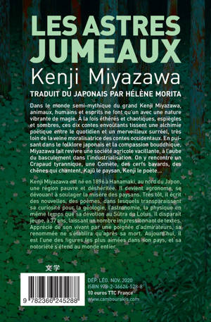 Après «Les Pieds nus de lumière», une nouvelle réédition de Kenji Miyazawa: un recueil de 10 nouvelles qui concentre tout ce qui caractérise l'écriture unique de cet auteur majeur, mêlant avec talent le monde des hommes, celui des animaux et celui des esprits. Comme nul autre, il propose une façon différente de percevoir la vie, mue par un élan spontané vers les autres et une grande sympathie pour la nature.
