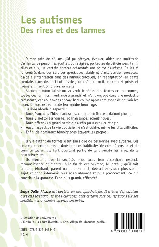 Durant près de 45 ans, j'ai pu côtoyer, évaluer, aider une multitude d'enfants, de personnes adultes, voire âgées, porteuses de déficiences. Parmi elles et eux, un certain nombre présentait une forme d'autisme. Je les ai rencontrés dans des services spécialisés, d'aide et d'intervention précoces, d'aide à l'intégration dans des milieux d'accueil, en réadaptation, en santé mentale, dans des institutions de jour et/ou de nuit, en cabinet privé, et même en insertion professionnelle. Beaucoup m'ont laissé un souvenir impérissable. Toutes ces personnes, toutes ces familles m'ont aidé à grandir et m'ont engagé dans une modestie croissante, car nous avons encore beaucoup à apprendre avant de pouvoir les aider. L'heure est venue de leur rendre hommage. Le livre aborde 5 aspects: - Nous évoquons l'idée d'autismes, car cet attribut est d'abord pluriel. - Nous y mettons à jour les connaissances scientifiques. - Nous offrons un grand nombre d'outils pour évaluer et agir. - Aucun aspect de la vie quotidienne n'est oublié, même les plus difficiles. - Enfin, de nombreux témoignages étayent les propos. Il y a autant de formes d'autismes que de personnes avec autisme. Ces enfants et ces adultes malmènent nos habitudes de compréhension et de communication. Ils font pourtant partie de la diversité humaine, de la neurodiversité. Ils méritent que la société, nous tous, leur accordions respect, reconnaissance et dignité. A la fin de cet ouvrage, le lecteur, qu'il soit profane, étudiant, parent ou professionnel, devrait en savoir plus sur le sujet et donc intervenir plus adéquatement et plus précocement, ce qui constitue la garantie d'une plus grande efficacité.