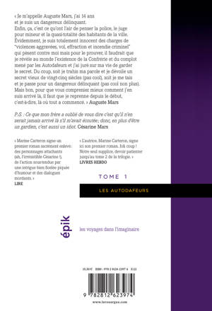À la mort de leur père, Auguste, un lycéen d'aujourd'hui, et sa petite soeur Césarine, autiste géniale, sont plongés tête la première dans une guerre secrète. Elle oppose depuis des siècles, La Confrérie et Les Autodafeurs. Nos deux héros vont devenir malgré eux les acteurs de ce conflit millénaire. Son enjeu ? Le contrôle du savoir et la main mise sur sa forme la plus ancienne : Les livres... Trilogie culte vendue à plus de 110 000 exemplaires (prix Libr'à nous et prix Imaginales des collégiens), Les Autodafeurs est la première série de Marine Carteron (autrice de Génération K, Dix, Romy et Julius, L'attaque des cubes et La (presque) grande évasion). Un classique à dévorer !
