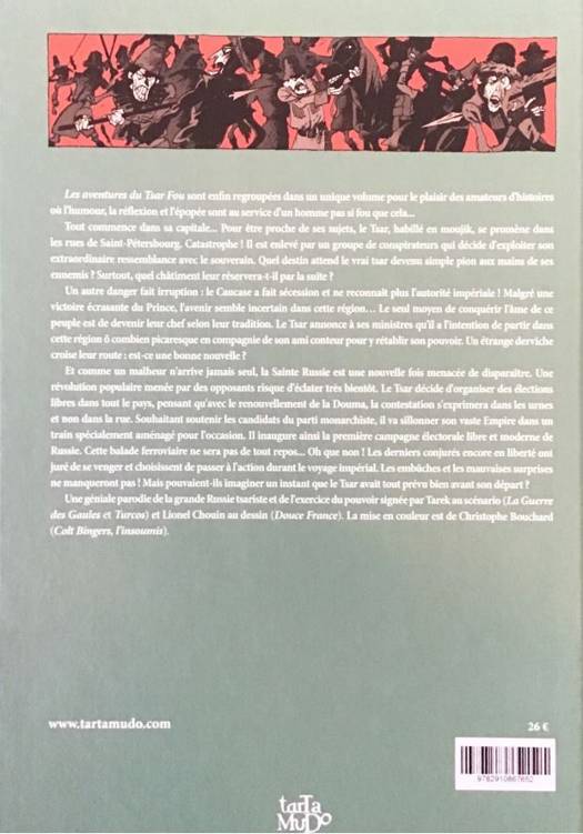 Pour être proche de ses nombreux sujets, le Tsar se promène dans les rues, habillé en moujik... Catastrophe ! Son altesse est enlevée par un groupe de conspirateurs qui décide d'exploiter son extraordinaire ressemblance avec le souverain ! Bien sûr, « le vrai Tsar » accepte leur idée folle : se faire passer pour... le Tsar ! Mais quel châtiment réservera ensuite le Tsar aux conspirateurs? Une géniale parodie de la grande Russie et de l'exercice du pouvoir signée : Tarek (Sir Arthur Benton, La Guerre des Gaules) et Lionel Chouin (Les mémoires mortes).